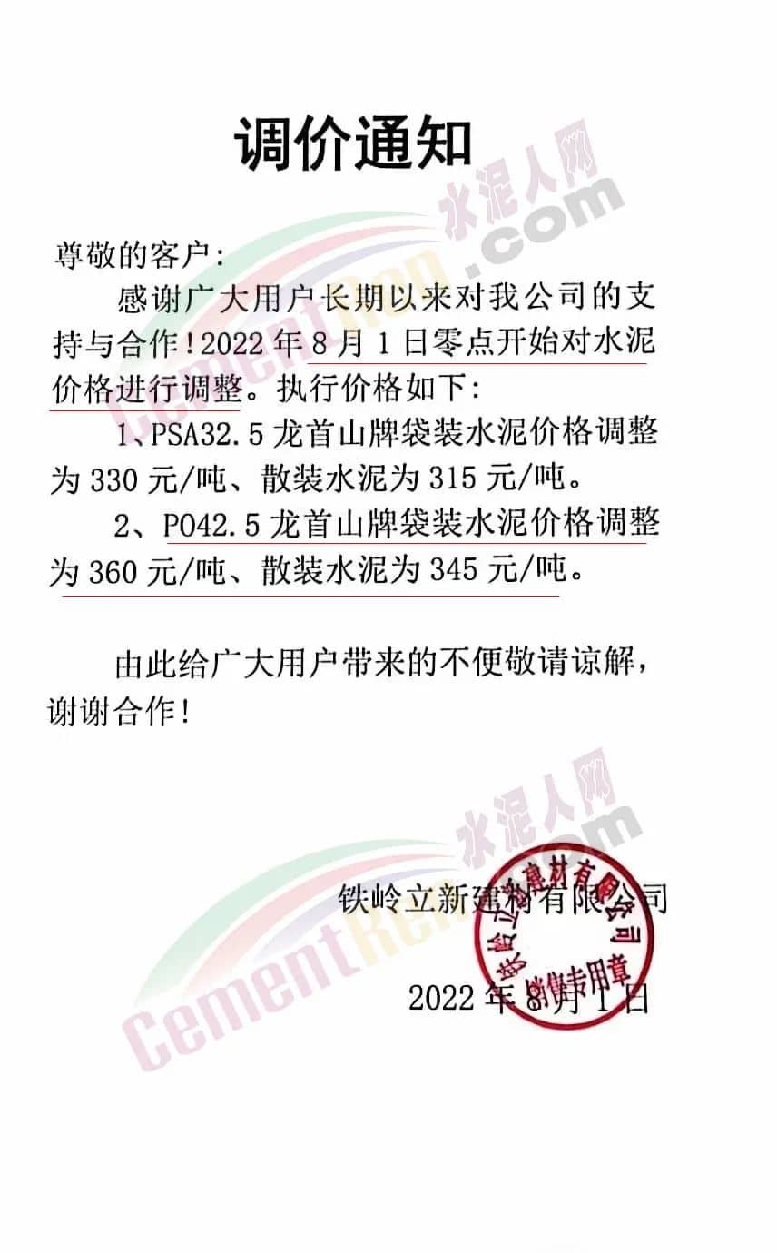 鐵嶺立新建材有限公司通知自8月1日零點(diǎn)開始對(duì)水泥價(jià)格進(jìn)行調(diào)整,調(diào)整后PSA32.5A龍首山袋裝水泥為330元/噸,散裝水泥為315元/噸。P.O42.5龍首山牌袋裝水泥為360元/噸,散裝水泥為345元/噸。