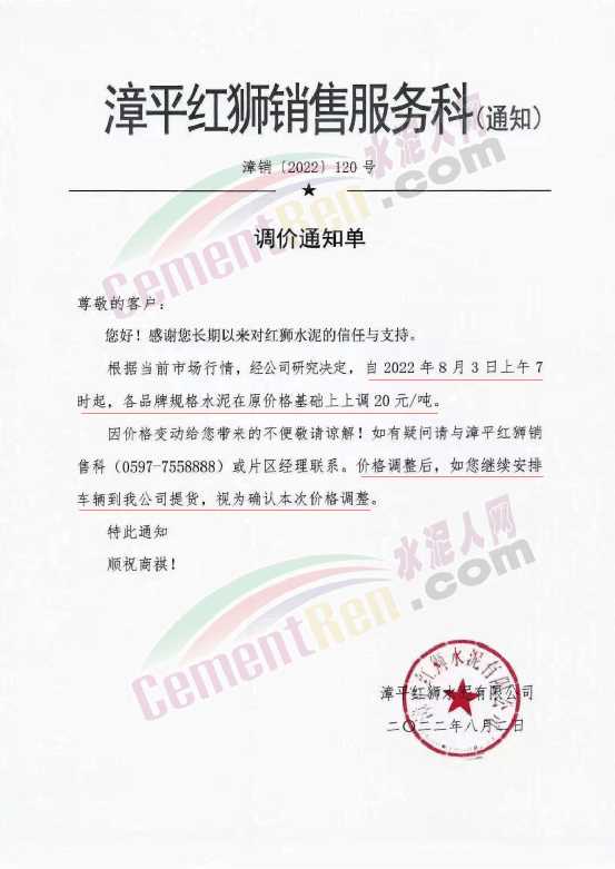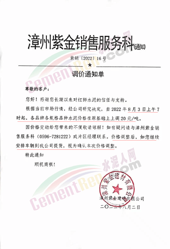 漳州紫金銷(xiāo)售服務(wù)科通知,根據(jù)當(dāng)前市場(chǎng)行情,經(jīng)公司研究決定,自8月3日上午7時(shí)起,各品牌各規(guī)格品種水泥價(jià)格在原基礎(chǔ)上上調(diào)20元/噸。價(jià)格調(diào)整后,如繼續(xù)安排車(chē)輛到公司提貨,視為確認(rèn)本次價(jià)格調(diào)整。
