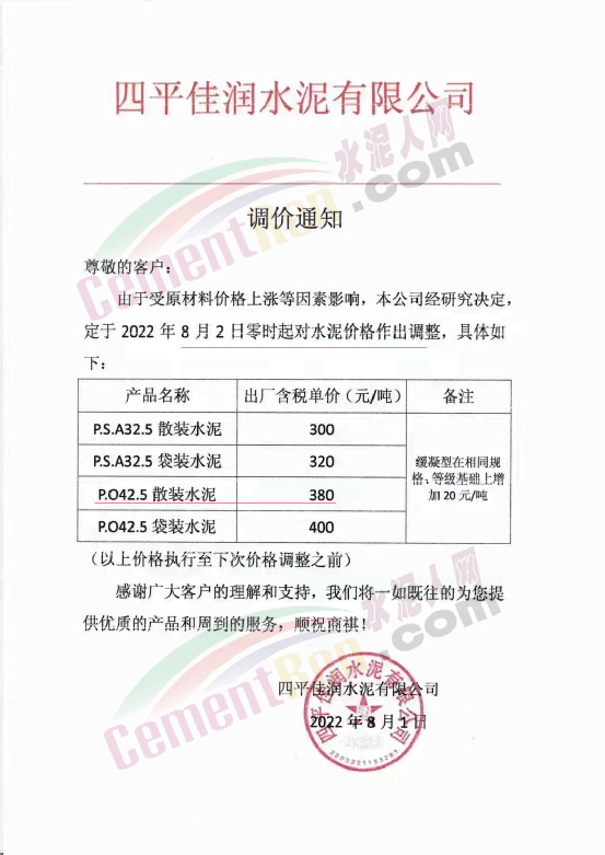 吉林四平佳潤(rùn)水泥有限公司通知8月2日零時(shí)起對(duì)水泥價(jià)格作出調(diào)整,調(diào)整后P.O42.5散裝水泥報(bào)價(jià)380元/噸,緩凝型在相同規(guī)格等級(jí)報(bào)價(jià)基礎(chǔ)上增加20元/噸。