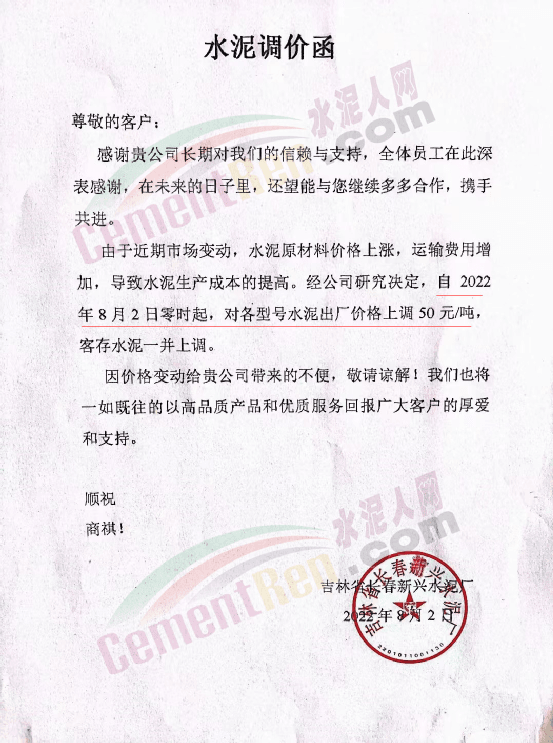 吉林省長(zhǎng)春新興水泥廠通知,由于市場(chǎng)變動(dòng),水泥原材料價(jià)格上漲,運(yùn)輸費(fèi)用增加,導(dǎo)致水泥成本提高。經(jīng)公司研究決定自8月2日零時(shí)起,對(duì)各型號(hào)水泥出廠價(jià)格上調(diào)50元/噸,客存水泥一并上調(diào)。