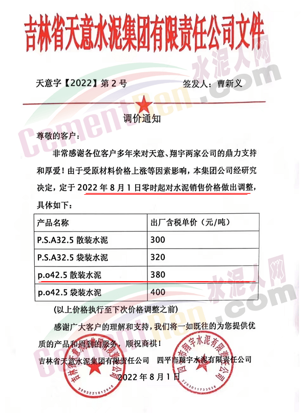 吉林天意水泥集團(tuán)通知,由于受原材料價(jià)格上漲等因素影響,集團(tuán)公司研究決定自8月1日起對(duì)水泥銷(xiāo)售價(jià)格作出調(diào)整,調(diào)整后P.O42.5散裝水泥出廠含稅價(jià)報(bào)380元/噸。