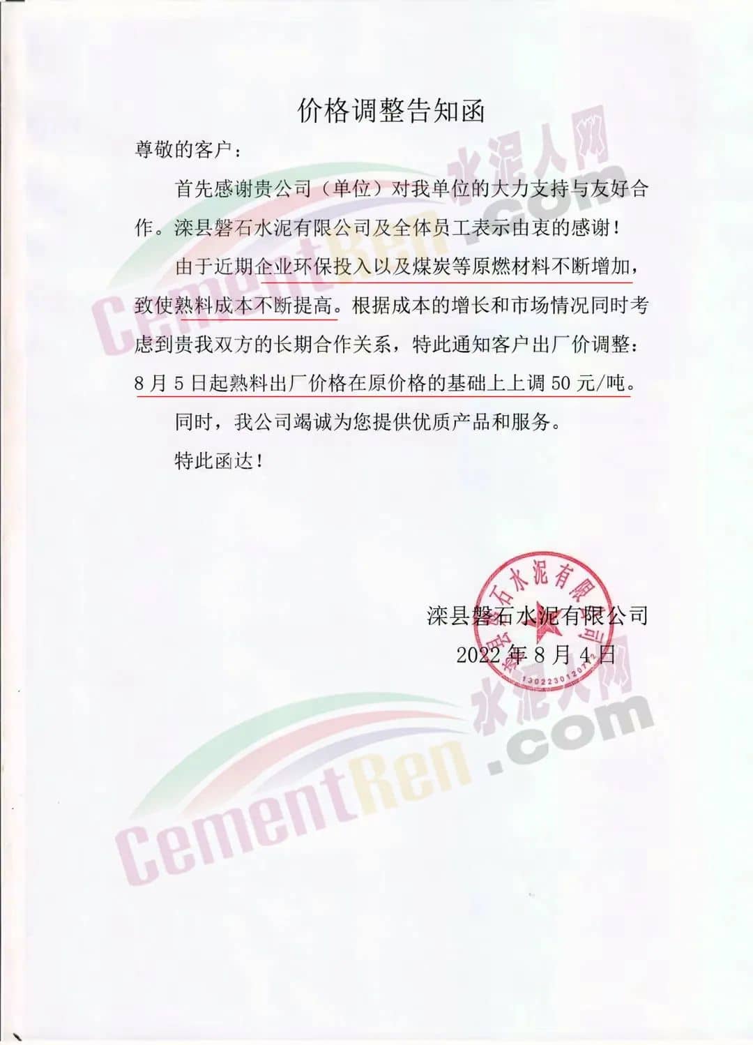 唐山圣龍水泥有限公司,通知由于近期企業(yè)環(huán)保投入以及煤炭等原燃材料不斷增加,致使熟料成本不斷提高。根據(jù)成本的增長和市場情況從8月5日起熟料出廠價格在原價格的基礎(chǔ)上上調(diào)50元/噸。