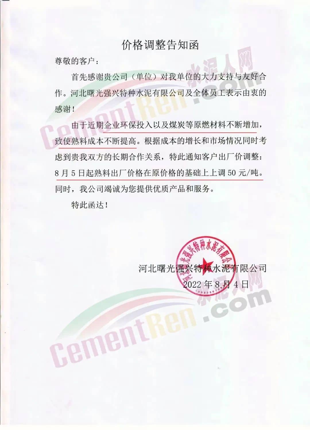 河北曙光強興特種水泥有限公司通知,由于近期企業(yè)環(huán)保投入以及煤炭等原燃材料不斷增加,致使熟料成本不斷提高。根據(jù)成本的增長和市場情況自8月5日起熟料出廠價格在原價格的基礎(chǔ)上上調(diào)50元/噸。