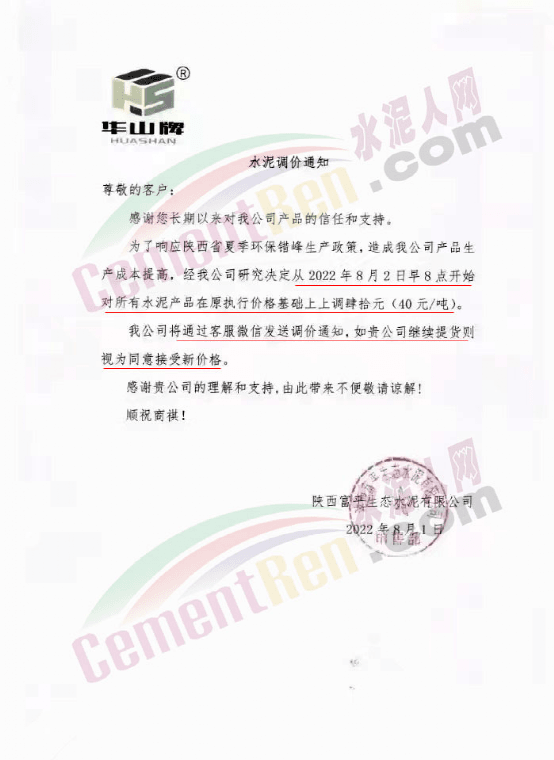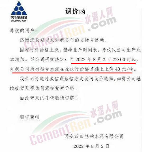 堯柏集團旗下西安藍田堯柏水泥有限公司、陜西實豐水泥股份有限公司、蒲城堯柏特種水泥有限公司等多家公司通知,因原材料價格上漲,錯峰生產(chǎn)時間長,導致公司生產(chǎn)成本增加,經(jīng)公司研究決定,自8月2日22時起對公司所有型號水泥在原執(zhí)行價格基礎(chǔ)上上調(diào)40元/噸。公司將通過微信或短信方式發(fā)送調(diào)價通知,如客戶繼續(xù)提貨則視為同意接受新價格。