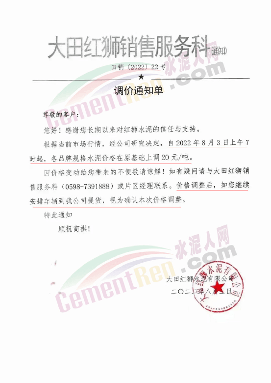 福建大田紅獅銷售服務(wù)科通知,根據(jù)當前市場行情,經(jīng)公司研究決定,自8月3日7時起,各品牌規(guī)格水泥價格在原基礎(chǔ)上上調(diào)20元/噸。價格調(diào)整后,如客戶繼續(xù)安排車輛提貨,視為確認本次價格調(diào)整。