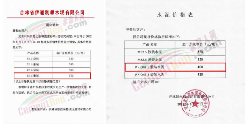 受遼寧區(qū)域水泥價(jià)格大幅上漲影響,吉林區(qū)域多家企業(yè)通知自8月2日起上調(diào)水泥價(jià)格50-55元/噸,價(jià)格上調(diào)后P.O42.5散裝水泥報(bào)價(jià)380-465元/噸。