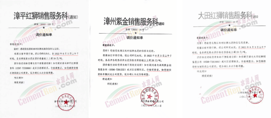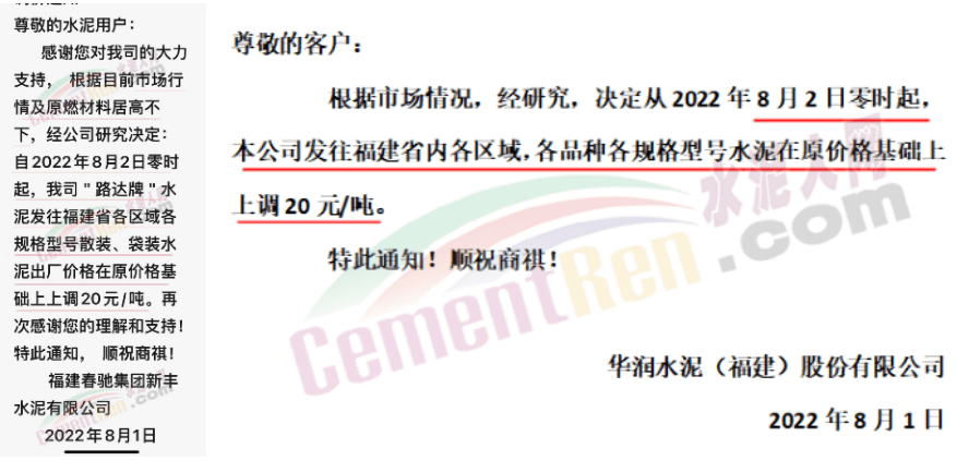 受前期長三角區(qū)域水泥、熟料同步上漲影響,福建區(qū)域主要品牌企業(yè)華潤、紅獅等于8月2日開始上調(diào)水泥價(jià)格20元/噸。