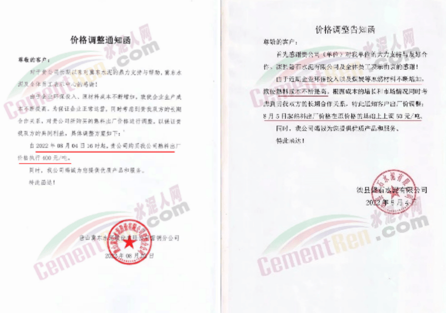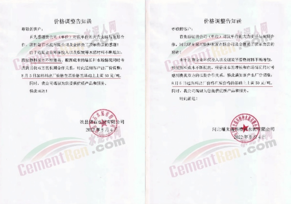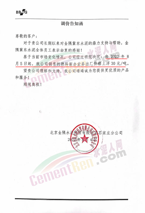 8月4日前后,河北唐山多家全能水泥廠通知自8月5日起上調(diào)水泥熟料價(jià)格50元/噸,主要品牌企業(yè)唐山冀東水泥經(jīng)貿(mào)公司通知熟料價(jià)格執(zhí)行400元/噸。企業(yè)漲價(jià)通知提到,漲價(jià)是由于近期企業(yè)環(huán)保投入以及煤炭等原燃材料不斷增加,致使熟料成本不斷提高。根據(jù)成本的增長和市場情況決定熟料價(jià)格一次性上調(diào)50元/噸。
