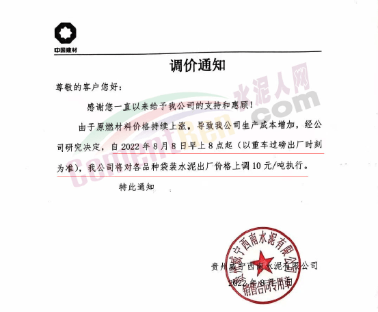 水泥人網(wǎng)通訊員消息,日前貴州威寧西南水泥有限公司通知,由于原燃材料價(jià)格持續(xù)上漲,導(dǎo)致公司生產(chǎn)成本增加,經(jīng)公司研究決定,自8月8日早上8點(diǎn)起,對(duì)各品種袋裝水泥出廠價(jià)格上調(diào)10元/噸。