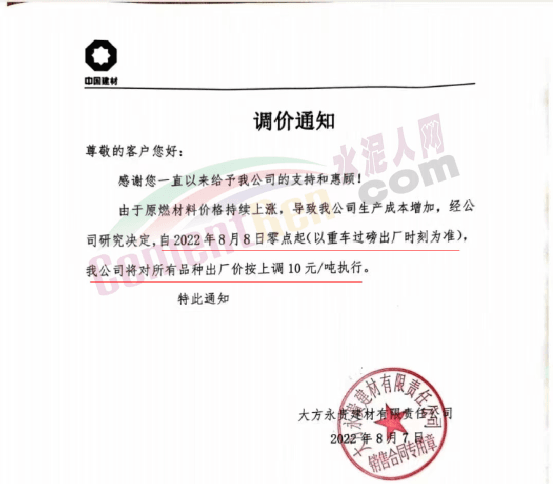 同期,大方永貴建材有限責(zé)任公司通知,自8月8日是零點(diǎn)起,對(duì)所有品牌出廠價(jià)按上調(diào)10元/噸執(zhí)行。