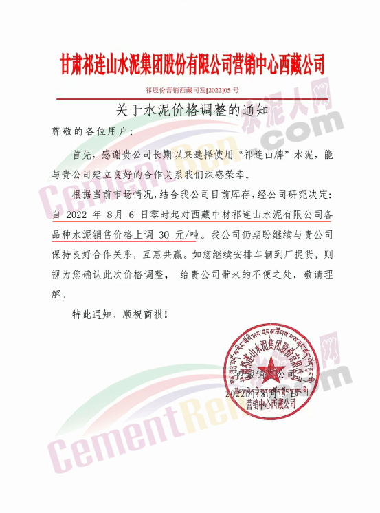 日前祁連山水泥集團(tuán)西藏公司通知,根據(jù)當(dāng)前市場(chǎng)情況,結(jié)合公司目前庫(kù)存,經(jīng)公司研究決定自8月6日零時(shí)起對(duì)西藏中材祁連山水泥有限公司各品種水泥銷售價(jià)格上調(diào)30元/噸。調(diào)價(jià)后如繼續(xù)安排車輛到廠提貨,則視為確認(rèn)本次調(diào)價(jià)。