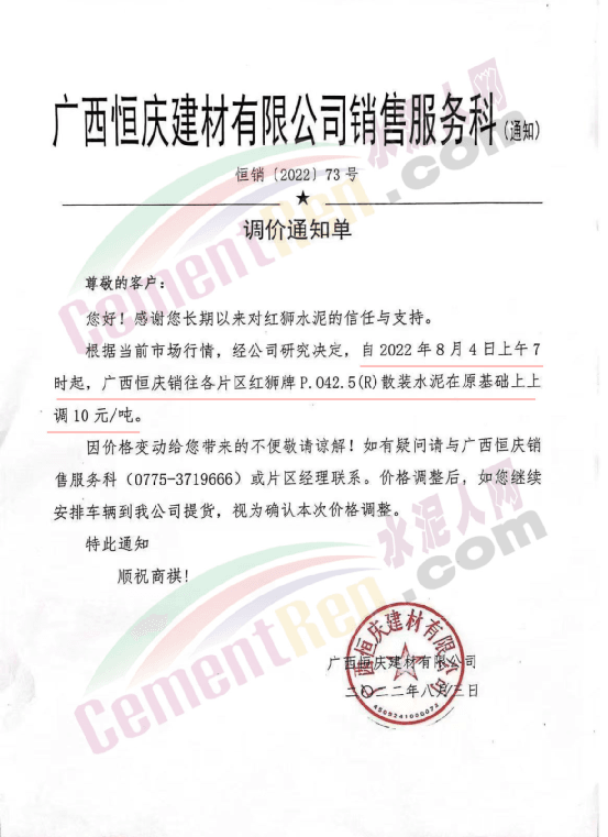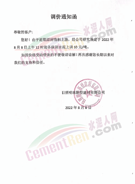 日照明珠新型建材有限公司通知,由于近期原材物料上漲,經(jīng)公司研究決定于8月月8日上午12時(shí)起各級(jí)別水泥上調(diào)10元/噸。