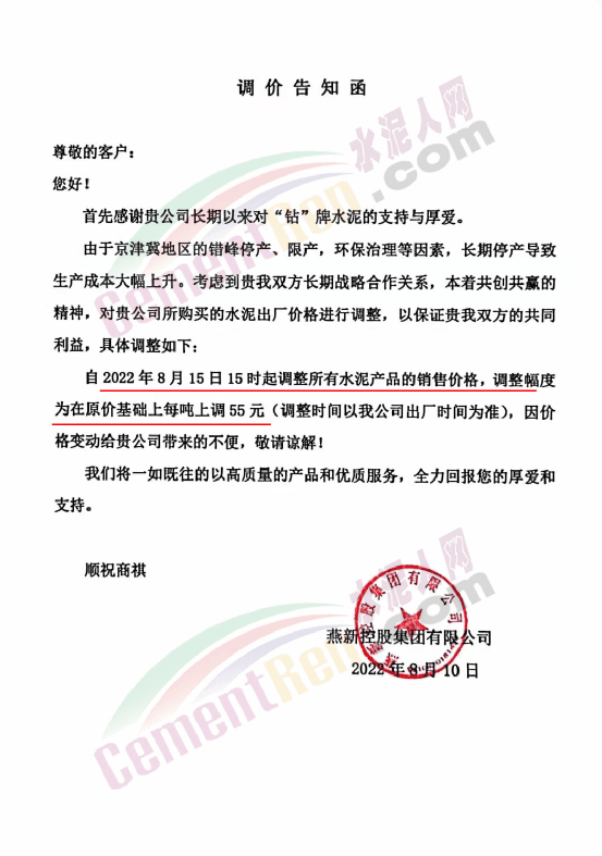 燕新控股集團有限公司通知由于京津冀地區(qū)的錯峰停產(chǎn)、限產(chǎn),環(huán)保治理等因素,長期停產(chǎn)導致生產(chǎn)成本大幅上升。公司自2022年8月15日15時起所有水泥產(chǎn)品的銷售價格上調55元/噸。