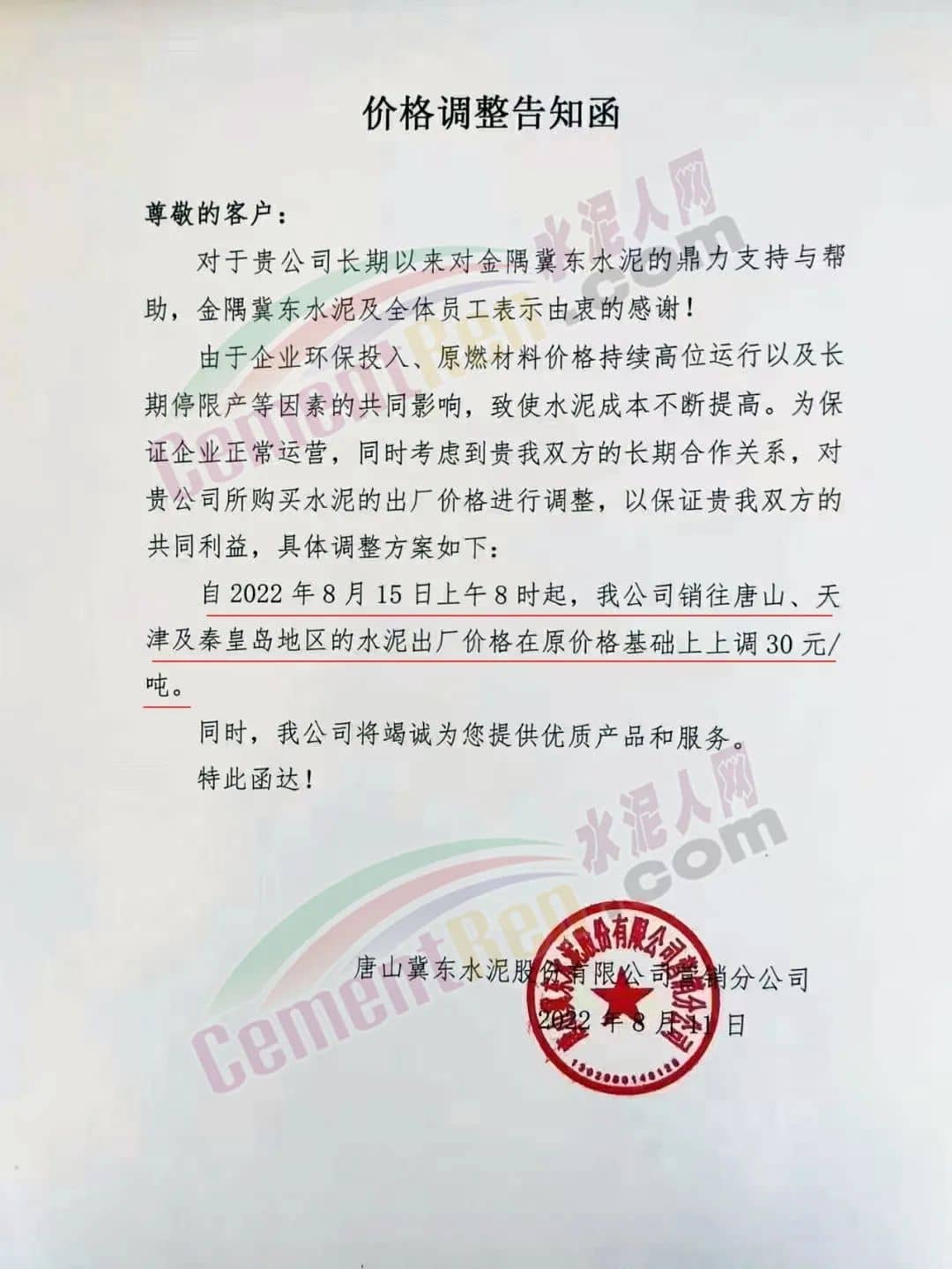 唐山冀東水泥通知,由于企業(yè)環(huán)保投入,原材料價格持續(xù)高位運行以及長期停限產(chǎn)等因素的共同影響,致使水泥成本不斷提高。自8月15日上午8時起,公司銷往唐山、天津及秦皇島地區(qū)的水泥出廠價格在原價基礎上上調30元/噸。