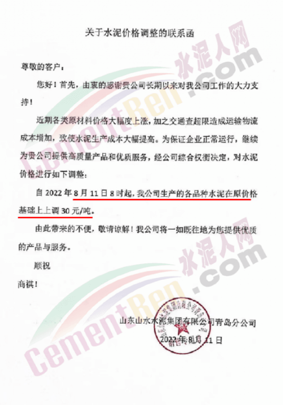 同期,山東山水水泥集團有限公司青島分公司通知,近期各類原材料價格大幅度上漲,加之交通查超限造成運輸物流成本增加,致使水泥生產(chǎn)成本大幅提高。經(jīng)公司綜合權衡決定,自8月11日8時起,對公司生產(chǎn)的各品種水泥在原價基礎上上調30元/噸。