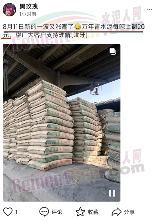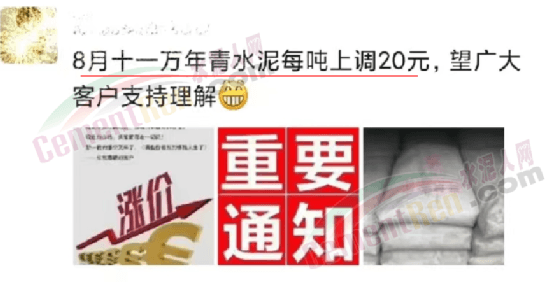 萬年青水泥通知,自8月11日起,上調20元/噸。
