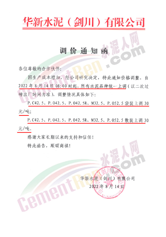 華新水泥(劍川)有限公司通知,因生產(chǎn)成本增加,經(jīng)公司研究決定自8月14日8時(shí)起,所有水泥品種統(tǒng)一上調(diào)30元/噸。