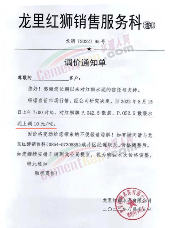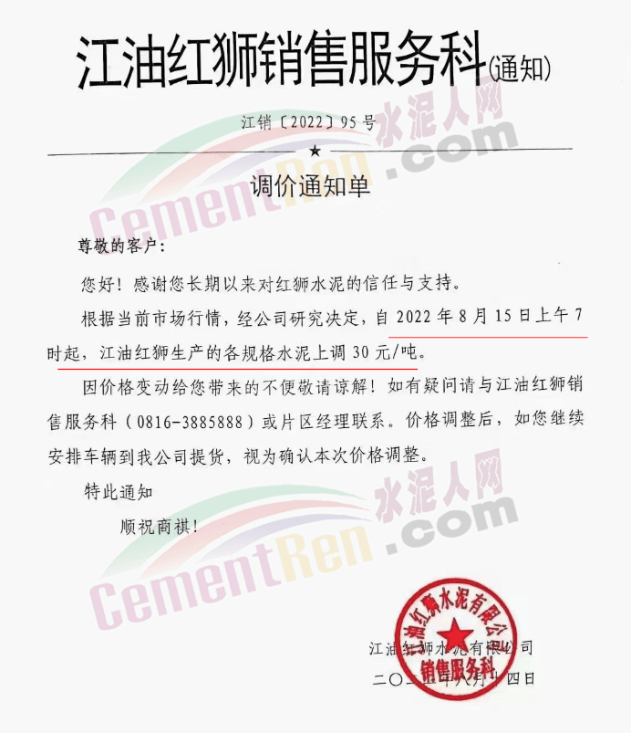 江油紅獅銷(xiāo)售服務(wù)科通知,根據(jù)當(dāng)前市場(chǎng)行情,經(jīng)公司研究決定,自2022年8月15日上午7時(shí)起,江油紅獅生產(chǎn)的各規(guī)格水泥上調(diào)30元/噸。價(jià)格調(diào)整后,如您繼續(xù)安排車(chē)輛到我公司提貨,視為確認(rèn)本次價(jià)格調(diào)整。