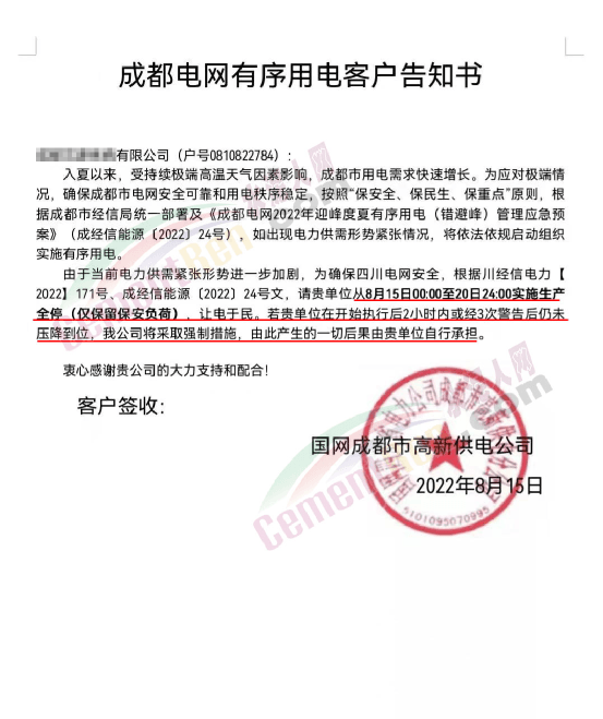 據(jù)水泥人網(wǎng)了解,國(guó)網(wǎng)成都市高新供電公司發(fā)布《成都電網(wǎng)有序用電客戶(hù)告知書(shū)》稱(chēng),入夏以來(lái),受持續(xù)極端高溫天氣因素影響,成都市用電需求快速增長(zhǎng)。為應(yīng)對(duì)極端情況,確保成都市電網(wǎng)安全可靠和用電秩序穩(wěn)定,按照“保安全、保民生、保重點(diǎn)”原則,根據(jù)成都市經(jīng)信局統(tǒng)一一部署及相關(guān)文件要求,如出現(xiàn)電力供需形勢(shì)緊張情況,將依法依規(guī)啟動(dòng)組織實(shí)施有序用電。