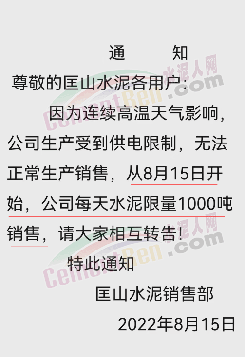 匡山水泥通知,從8月15起公司每天水泥限量1000噸銷(xiāo)售。