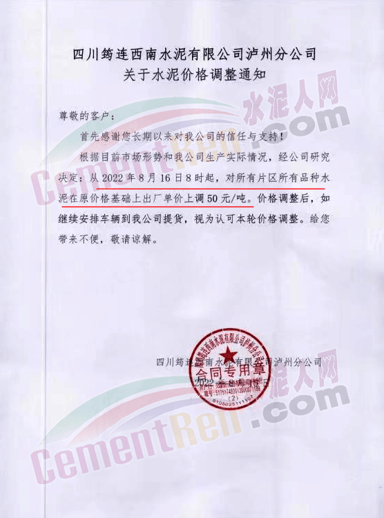 四川筠連西南水泥有限公司瀘州分公司通知,根據(jù)目前市場(chǎng)形勢(shì)和我公司生產(chǎn)實(shí)際情況,經(jīng)公司研究決定,從2022年8月16日8時(shí)起,對(duì)所有片區(qū)所有品種水泥在原價(jià)格基礎(chǔ)上出廠單價(jià)上調(diào)50元/噸。價(jià)格調(diào)整后,如繼續(xù)安排車(chē)輛到我公司提貨,視為認(rèn)可本輪價(jià)格調(diào)整。