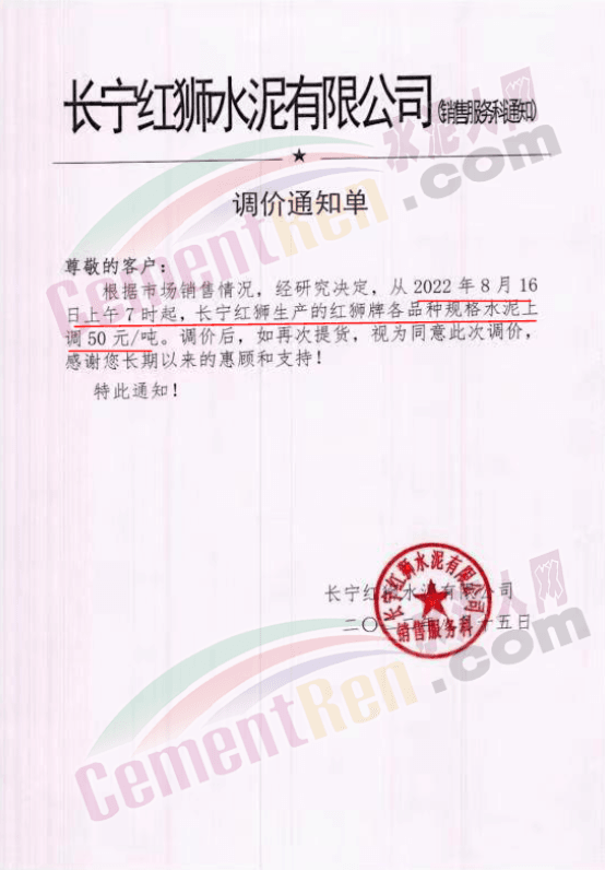 長(zhǎng)寧紅獅水泥有限公司銷(xiāo)售服務(wù)科通知根據(jù)市場(chǎng)銷(xiāo)售情況,經(jīng)研究決定,從2022年8月16日上午7時(shí)起,長(zhǎng)寧紅獅生產(chǎn)的紅獅牌各品種規(guī)格水泥上調(diào)50元/噸。調(diào)價(jià)后,如再次提貨,視為同意此次調(diào)價(jià)。