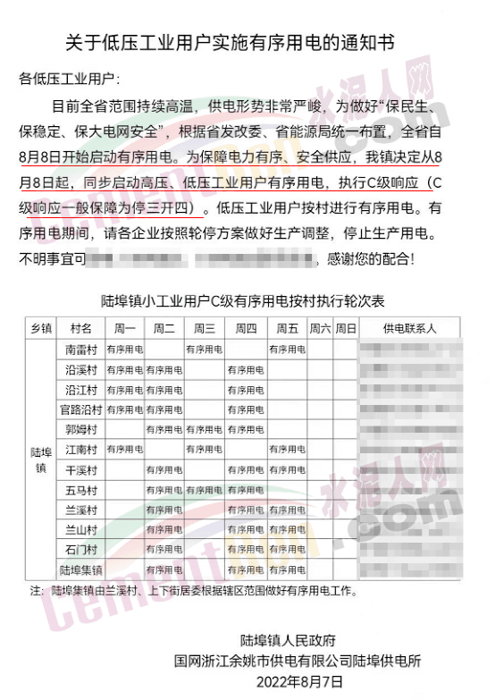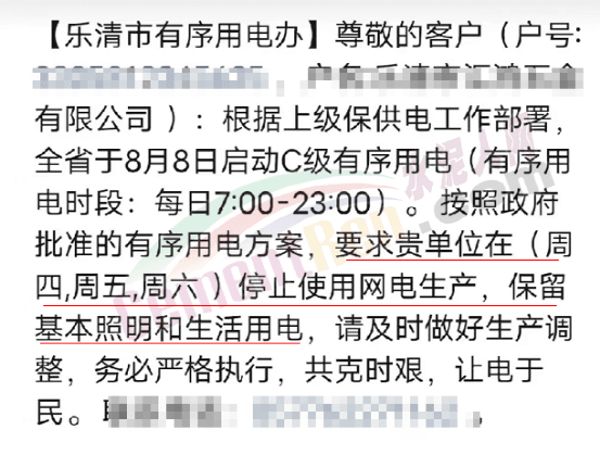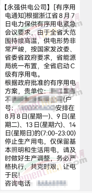 8月初,浙江省發(fā)改委發(fā)布《關(guān)于同意啟動(dòng)C級(jí)有序用電的函》給國(guó)網(wǎng)浙江電力有限公司稱(chēng),經(jīng)請(qǐng)示省政府同意,浙江省8月8日根據(jù)用電缺口實(shí)際情況啟動(dòng)C級(jí)1250萬(wàn)千瓦有序用電措施,8月9日再視情況調(diào)整有序用電等級(jí)。請(qǐng)認(rèn)真做好有序用電細(xì)化措施,壓實(shí)各地責(zé)任,確保民生用電,絕不能拉閘限電。