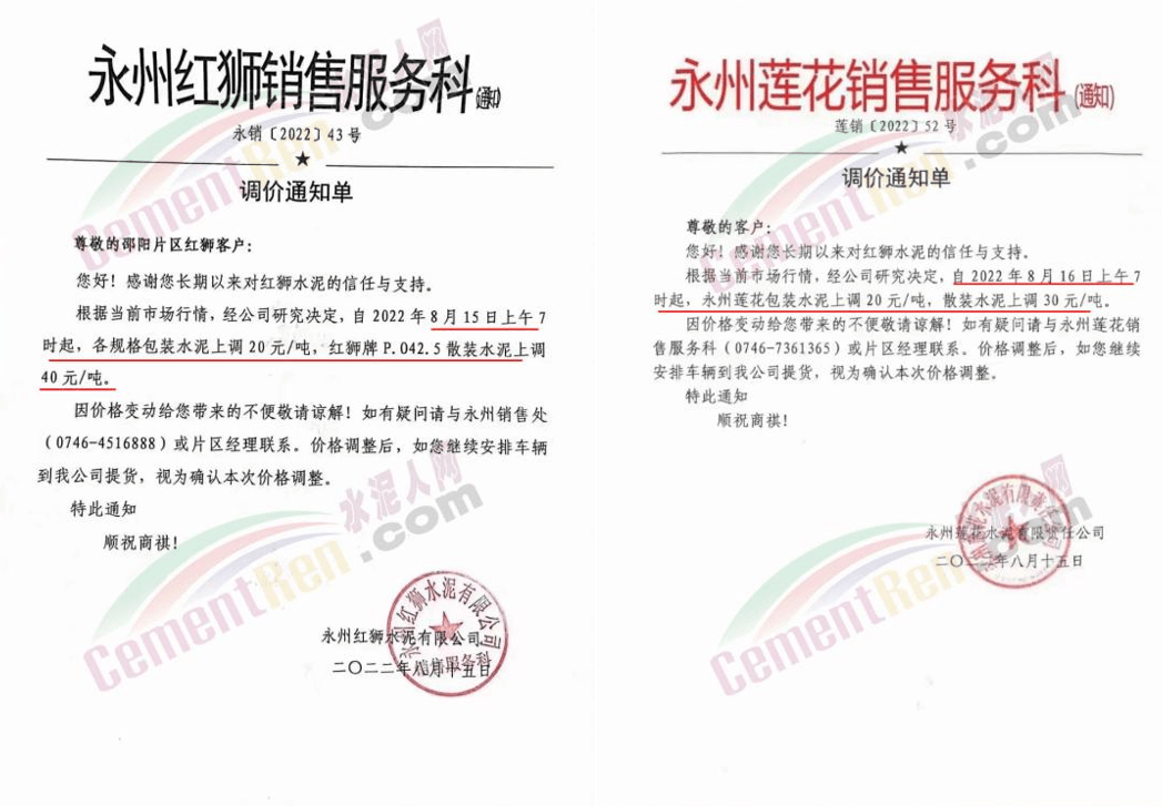 湖南永州紅獅針對(duì)不同片區(qū)包裝水泥上調(diào)10-20元/噸,P.O42.5散裝水泥上調(diào)30-40元/噸;永州蓮花包裝水泥上調(diào)20元/噸,散裝水泥上調(diào)30元/噸。