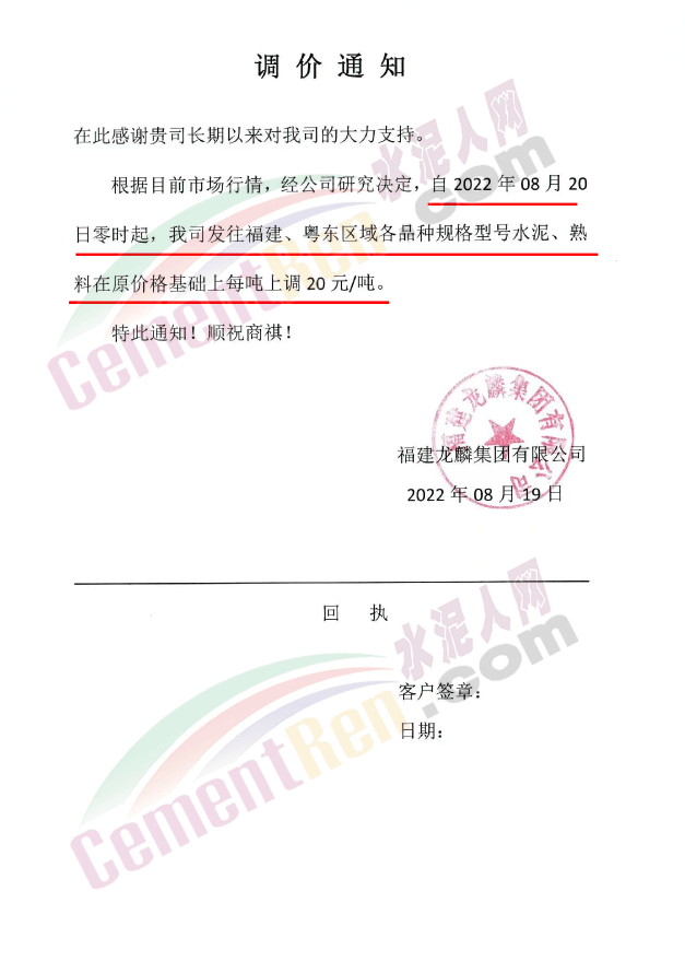 重要通知,8月19日起水泥漲價(jià),32.5、42.5水泥全品種集體上漲。