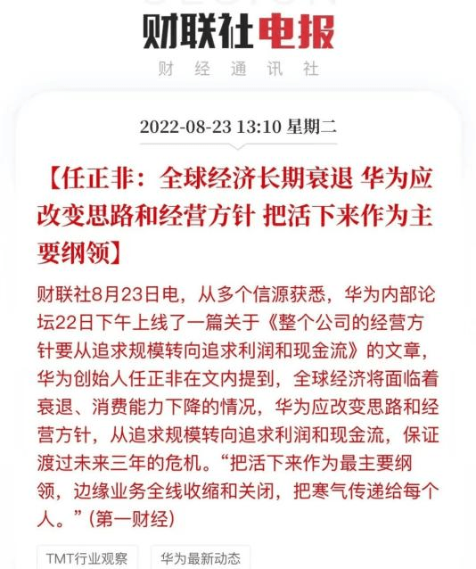 近日,華為創(chuàng)始人任正非在內部發(fā)文中提到:全球經(jīng)濟面臨著衰退、消費能力下降的情況,華為應該改變思路和經(jīng)營方針,從追求規(guī)模轉向追求利潤和現(xiàn)金流,保證渡過未來三年的危機。“把活下來作為最主要綱領,邊緣業(yè)務全線收縮和關閉,把寒氣傳遞給每個。”