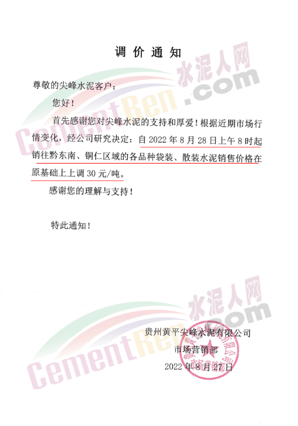 同日,貴州區(qū)域多家企業(yè)通知上調(diào)水泥價(jià)格。黃平尖峰水泥通知自8月28日上午8時(shí)起銷往黔東南、銅仁區(qū)域水泥價(jià)格上 調(diào)30元/噸。