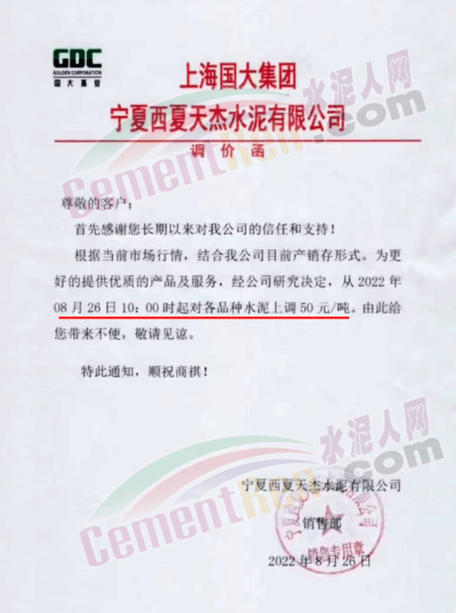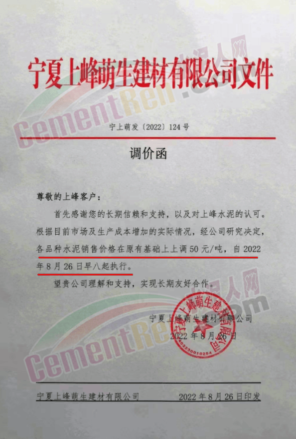 內(nèi)蒙古松塔水泥通知,8月27日8時(shí)起各品種水泥價(jià)格上調(diào)50元/噸。