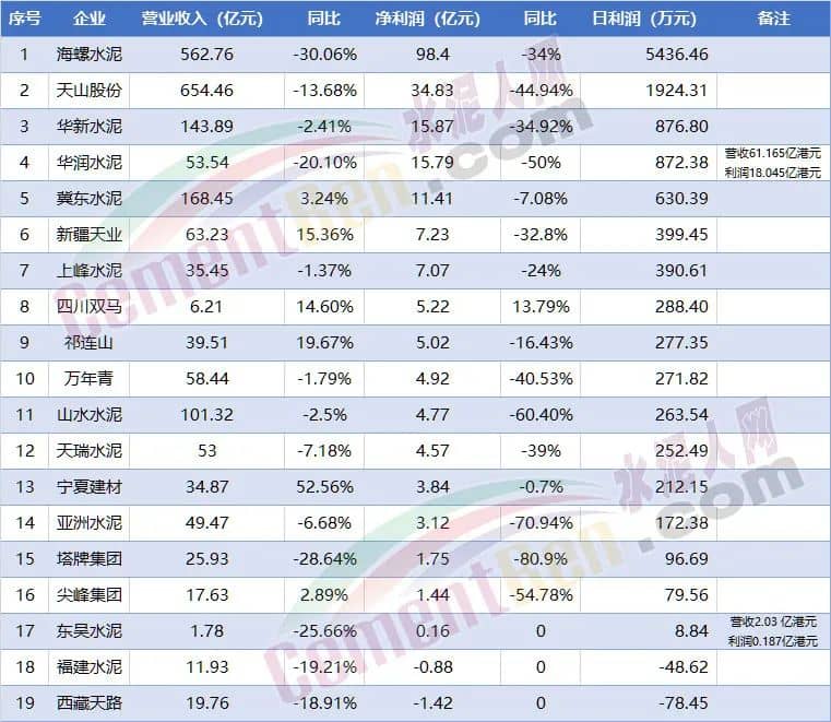 海螺水泥營(yíng)收、利潤(rùn)均下滑三成以上。凈利潤(rùn)98.4億元,首次跌至100億元以下。仍處于19家上市企業(yè)凈利潤(rùn)排名第一位,日利潤(rùn)達(dá)5436.46萬(wàn)元,遙遙領(lǐng)先于同行業(yè)其他企業(yè)。