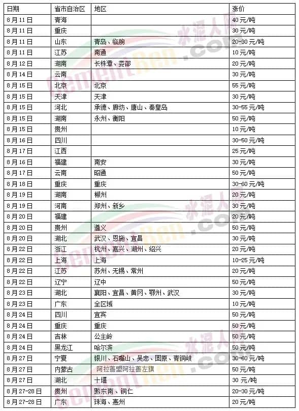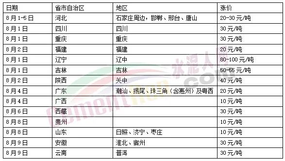 據(jù)水泥人網(wǎng)不完全統(tǒng)計7月中旬至8月初江蘇、浙江、上海、安徽、河南、山東、河北、福建、遼寧、吉林、陜西、重慶、四川、貴州、廣西等20多個區(qū)域水泥價格通知上調(diào)。進(jìn)入8月中旬,發(fā)布漲價函的區(qū)域進(jìn)一步擴(kuò)大至青海、寧夏、內(nèi)蒙、黑龍江、湖北、北京、天津等30多個區(qū)域。