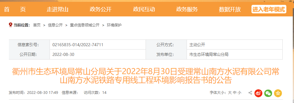 浙江省衢州市生態(tài)環(huán)境局常山分局發(fā)布《關(guān)于2022年8月30日受理常山南方水泥有限公司常山南方水泥鐵路專用線工程環(huán)境影響報(bào)告書的公告》