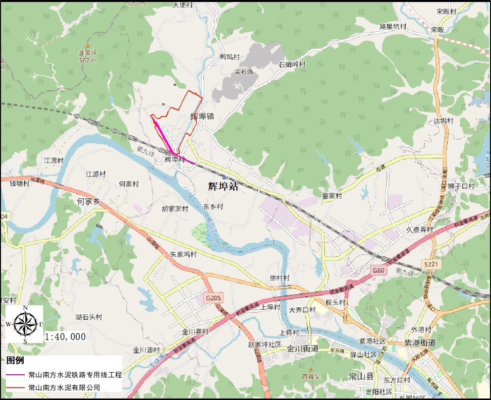 2022年5月19日,浙江省發(fā)展和改革委員會(huì)核準(zhǔn)了本工程,項(xiàng)目名稱“常山南方水泥鐵路專用線工程”,項(xiàng)目代碼2205-330000-04-01-161771。本工程在現(xiàn)有鐵路九景衢鐵路的輝埠站九江端接軌,沿九景衢鐵路的北側(cè)向西布線至廠區(qū),全長(zhǎng)約1.79km,采用專用線標(biāo)準(zhǔn)。輝埠站九江端約270m范圍調(diào)整軌道增設(shè)道岔,輝埠站與廠區(qū)之間約345m新建專用線,進(jìn)廠后利用預(yù)留用地設(shè)廠區(qū)站。廠區(qū)站用于原煤卸車和水泥裝車。本專用線設(shè)計(jì)運(yùn)量為170萬噸/年,本次專用線工程不改變廠區(qū)原有產(chǎn)能。