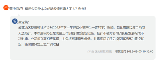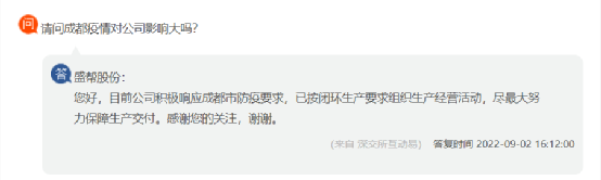 盛幫股份回復(fù),目前公司積極響應(yīng)成都市防疫要求,已按閉環(huán)生產(chǎn)要求組織生產(chǎn)經(jīng)營(yíng)活動(dòng),盡最大努力保障生產(chǎn)交付。