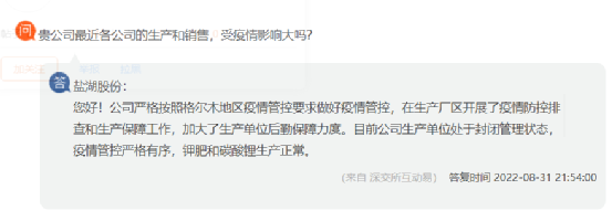 鹽湖股份回復(fù):公司嚴(yán)格按照格爾木地區(qū)疫情管控要求做好疫情管控,在生產(chǎn)廠區(qū)開(kāi)展了疫情防控排查和生產(chǎn)保障工作,加大了生產(chǎn)單位后勤保障力度。目前公司生產(chǎn)單位處于封閉管理狀態(tài),疫情管控嚴(yán)格有序,鉀肥和碳酸鋰生產(chǎn)正常。
