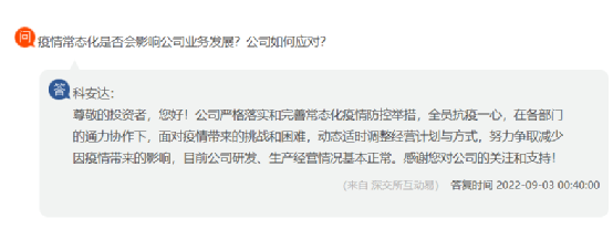 深圳從事軌道交通產(chǎn)品研發(fā)、生產(chǎn)、銷(xiāo)售的科安達(dá)回復(fù)公司嚴(yán)格落實(shí)和完善常態(tài)化疫情防控舉措,全員抗疫一心,在各部門(mén)的通力協(xié)作下,面對(duì)疫情帶來(lái)的挑戰(zhàn)和困難,動(dòng)態(tài)適時(shí)調(diào)整經(jīng)營(yíng)計(jì)劃與方式,努力爭(zhēng)取減少因疫情帶來(lái)的影響,目前公司研發(fā)、生產(chǎn)經(jīng)營(yíng)情況基本正常。