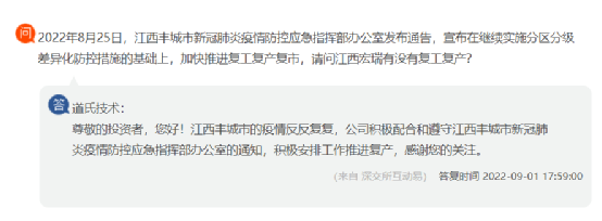 江西道氏技術(shù)回復(fù)投資者稱(chēng),江西豐城市的疫情反反復(fù)復(fù),公司積極配合和遵守江西豐城市新冠肺炎疫情防控應(yīng)急指揮部辦公室的通知,積極安排工作推進(jìn)復(fù)產(chǎn)。
