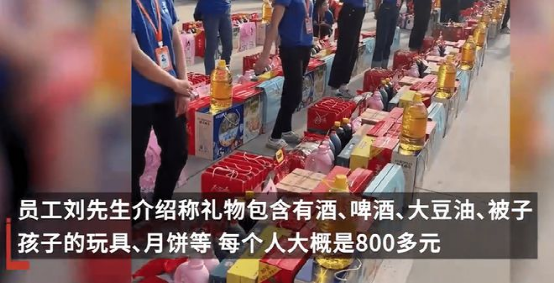 9月9日,江蘇徐州。一公司花費(fèi)27萬(wàn)左右給300名工人每人發(fā)放了30件中秋禮品。公司劉先生稱,每個(gè)人禮品價(jià)值大概是800多元,公司逢年過(guò)節(jié)就這樣,為此還遭到了同行的投訴。福利太好了,工人在公司的地位很重要,領(lǐng)導(dǎo)和工人都來(lái)自農(nóng)村,逢年過(guò)節(jié)送點(diǎn)福利,也是希望工人開(kāi)心。