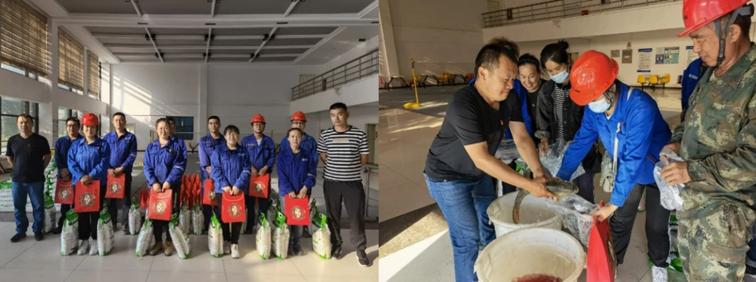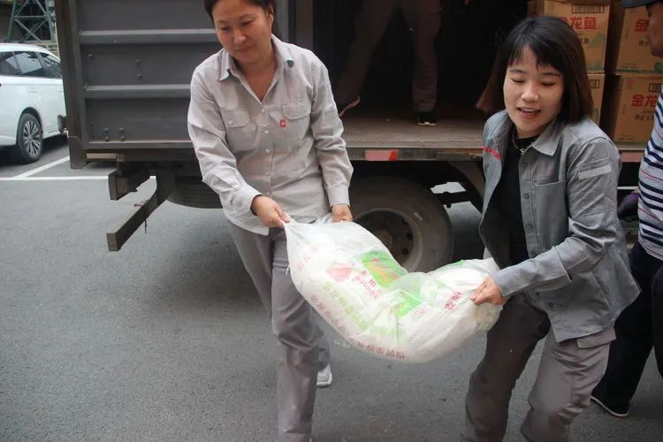 工會(huì)主席袁康林興奮的為員工裝魚(yú),“快來(lái),袋子接好嘍,魚(yú)要跑了!”大家圍在一起,歡快的笑聲在職工食堂回蕩。