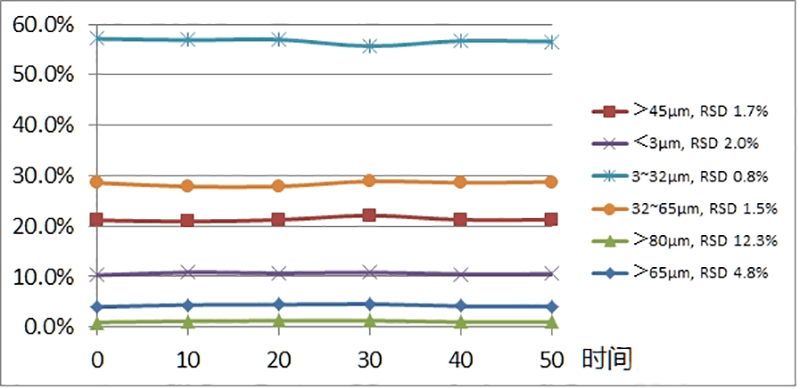 長時間連續(xù)的工作,對在線系統(tǒng)的防污染及自清潔能力提出了很高的要求,歐美克在線系統(tǒng)通過風(fēng)刀反向增壓紊流自動清洗技術(shù)顯著延長了系統(tǒng)的免人工維護(hù)時間。相較于傳統(tǒng)順序壓力梯度清洗方式,歐美克在線系統(tǒng)的窗口自潔能力得到了極大地提高,顯著地降低了人工手動清洗測試窗口的頻度,同時保障了測試結(jié)果始終可靠!以某品牌的PO42.5水泥樣品為例,在風(fēng)刀自動清洗維護(hù)下,系統(tǒng)無人干預(yù)連續(xù)工作3個月以上,45um余量、3-32um含量、32-65um含量、小于3um含量皆能保持良好的重現(xiàn)性,且無趨勢性偏移。在此案例中,無人干預(yù)連續(xù)工作超過3個月,以上含量連續(xù)監(jiān)控相對標(biāo)準(zhǔn)偏差均在2%以內(nèi)。