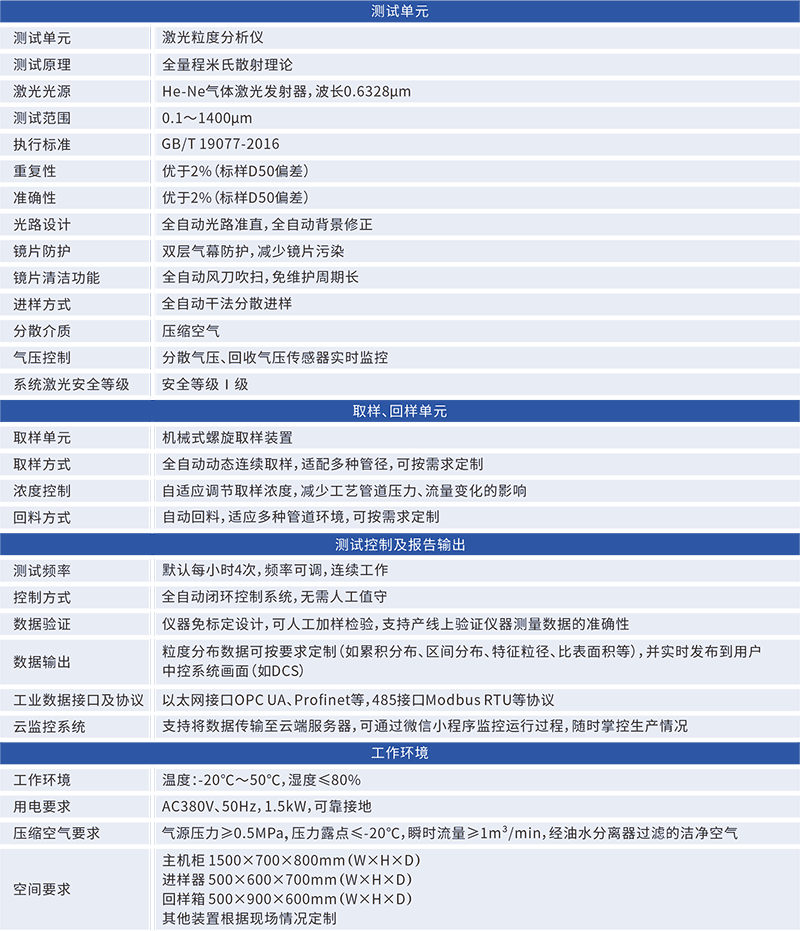 隨著粉體工業(yè)智能化生產(chǎn)(工業(yè)4.0)和減碳等發(fā)展需求,作為粉體材料加工中關(guān)鍵質(zhì)量表征的粒度信息的在線檢測需求越來越強(qiáng)烈。良好的產(chǎn)線實時粒度測量可以及時根據(jù)物料信息調(diào)整產(chǎn)線參數(shù),使生產(chǎn)物料質(zhì)量一致性更高,也有利于多因素復(fù)雜生產(chǎn)事件的確認(rèn)、管理和追溯,及時發(fā)現(xiàn)產(chǎn)線設(shè)備異常,降低生產(chǎn)中斷和設(shè)備故障的風(fēng)險。全自動的在線測試可以節(jié)省人工,自動將分析結(jié)果傳輸至產(chǎn)線智能中控平臺,結(jié)合多種智能化數(shù)據(jù)進(jìn)行綜合評判和生產(chǎn)過程優(yōu)化。對于產(chǎn)線的轉(zhuǎn)產(chǎn)亦可以快速響應(yīng),縮短產(chǎn)線調(diào)整時間,減少物料和能源的浪費(fèi)和產(chǎn)線的損耗。