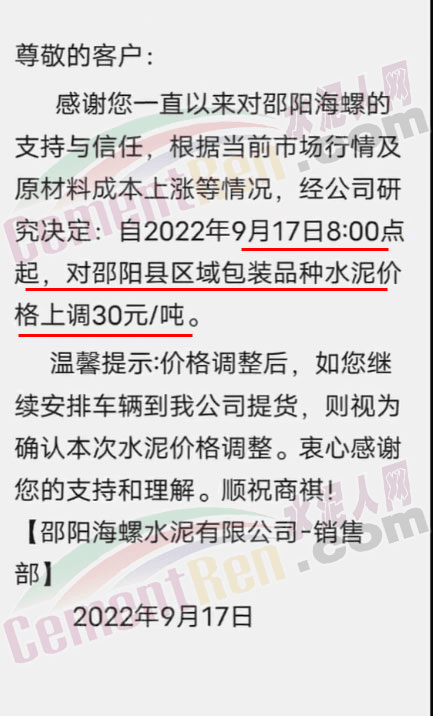 湖南寧鄉(xiāng)南方水泥有限公司銷售部通知根據(jù)當(dāng)前市場行情及原材料成本上漲等情況,經(jīng)公司研究決定自2022 年9月20日0時(shí)起,對各區(qū)域、各品種的水泥出廠價(jià)在原基礎(chǔ)上整體上調(diào)50元/噸。