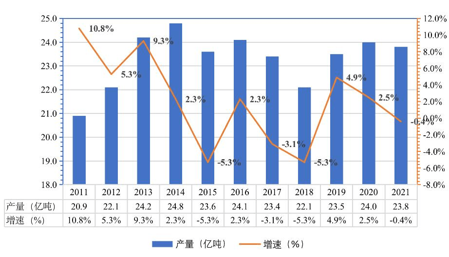 2011-2021年我國水泥產(chǎn)量及增速