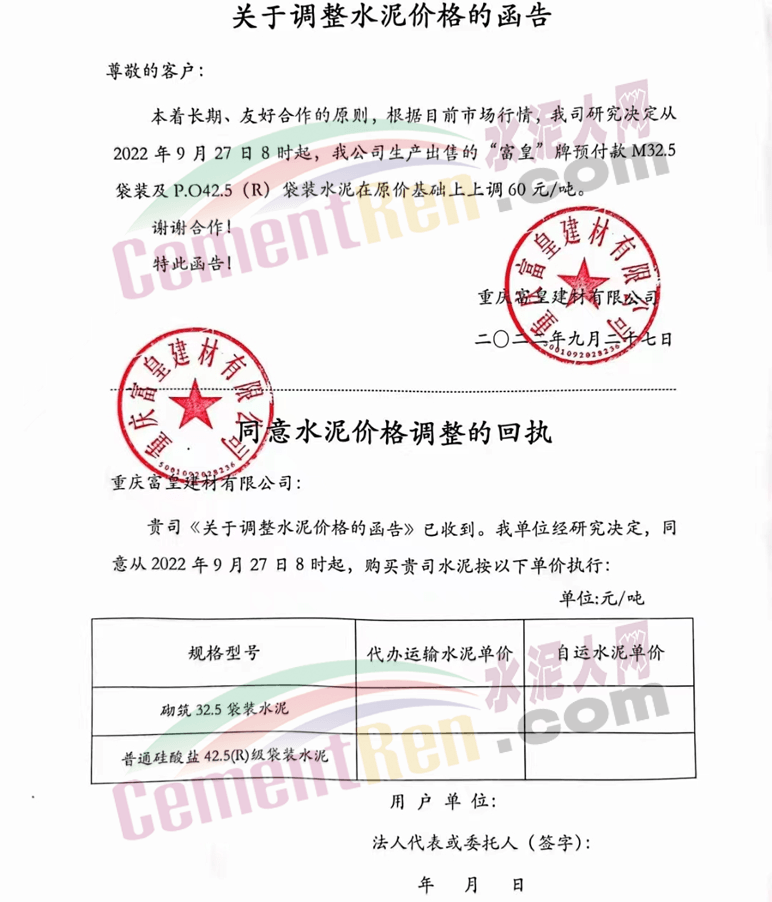 重慶市富豐水泥集團(tuán)特種水泥有限公司發(fā)布通知稱:根據(jù)目前市場行情變化,經(jīng)我司研究決定,從2022年9月27日早上8:00起,供應(yīng)貴公司各型號水泥出廠價格在原基礎(chǔ)上上調(diào)60元/噸。