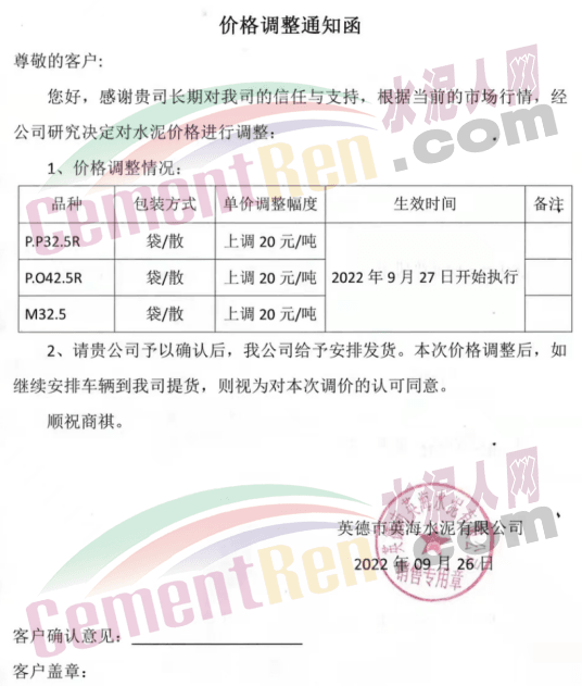 英德市恒業(yè)建材有限公司發(fā)布通知稱:自2022年9月27日零時起,我公司生產(chǎn)的P.P32.5R包裝水泥出廠價格上調(diào)20元/噸;P.P32.5R散裝水泥出廠價格上調(diào)20元/噸; M32.5包裝水泥出廠價格上調(diào)20元/噸。