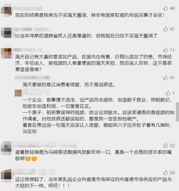 對于被指產(chǎn)品“雙標(biāo)”,海天味業(yè)在聲明中解釋稱,每個國家和地區(qū)的食品法規(guī)標(biāo)準(zhǔn)不盡相同,對應(yīng)的產(chǎn)品標(biāo)識也有不同。產(chǎn)品一國(地區(qū))一標(biāo),國內(nèi)外食品行業(yè)乃至其他很多非食品行業(yè)都是這樣做。隨著多元化消費需求,無論是國內(nèi)客戶還是國外經(jīng)銷商都會經(jīng)常提出定制產(chǎn)品的需求,定制化產(chǎn)品必然帶來產(chǎn)品標(biāo)識越來越多,有的品質(zhì)不一樣,有的品名不一樣。海天產(chǎn)品的內(nèi)控標(biāo)準(zhǔn)要求大多都高于甚至遠(yuǎn)高于國家標(biāo)準(zhǔn),同一品質(zhì)的產(chǎn)品,國內(nèi)國際的內(nèi)控標(biāo)準(zhǔn)都一致。“用‘雙標(biāo)’挑起消費者和中國品牌企業(yè)的矛盾對立,不僅打擊了中國老百姓的消費信心,更會影響‘中國造’的世界聲譽。”