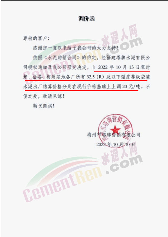 水泥人網(wǎng)通訊員消息:日前,梅州市塔牌營銷有限公司通知,經福建塔牌水泥有限公司授權通知及公司研究決定,自10月13日 零時起,福塔、梅州基地各廠所有32.5(R)及以下強度等級袋裝水泥出廠價上調20元/噸。